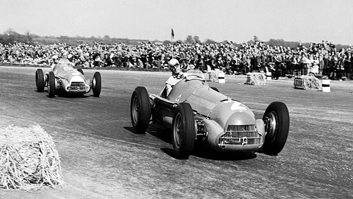 - Four Alfetta 158 race cars take to the Silverstone race track to compete in the inaugural Formula One race